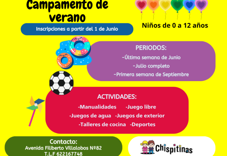 Nuestras queridas vecinas de la guardería Chispitinas organizan el campamento de verano para este curso, abierto a todo aquel que quiera disfrutar de las múltiples actividades que ofrecen. Si tú o tus peques tienen entre 0 y 12 años, ¡este es tu campamento!