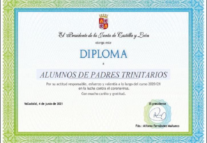 En el acto de reconocimiento y homenaje a profesorado y alumnado, celebrado el pasado 4 de junio, se hizo entrega de un diploma, firmado por el Presidente de la Junta de Castilla y León Alfonso Fernández Mañueco, a una representación de alumnos llegados desde diferentes puntos de la Comunidad.